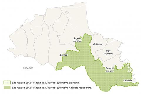 Le site Natura 2000 « Massif des Albères » s’étale sur une partie du massif du même nom et présente trois zones au relief différent : le piémont peu pentu, une partie intermédiaire avec des alvéoles en forte pente et les crêtes. Culminant à 1174 m au Pic de Pradets et chevauchant à l’est une partie du site Natura 2000 Côte rocheuse des Albères, le site accueille une série remarquable d’étages de végétation, du thermo méditerranéen (parties abritées proches du littoral) au montagnard (hêtraies, milieux rocheux, nardaies), en passant par le méditerranéen (maquis, chênaies). De nombreuses espèces d’intérêt communautaire sont également présentes sur le massif, justifiant la désignation du site du Massif des Albères au titre de la « directive Habitat Faune Flore ». La diversité des milieux et la présence d’un passage migratoire majeur explique d’autre part la diversité des espèces d’oiseaux rencontrés, justifiant la désignation du site au titre de la « directive Oiseau ».